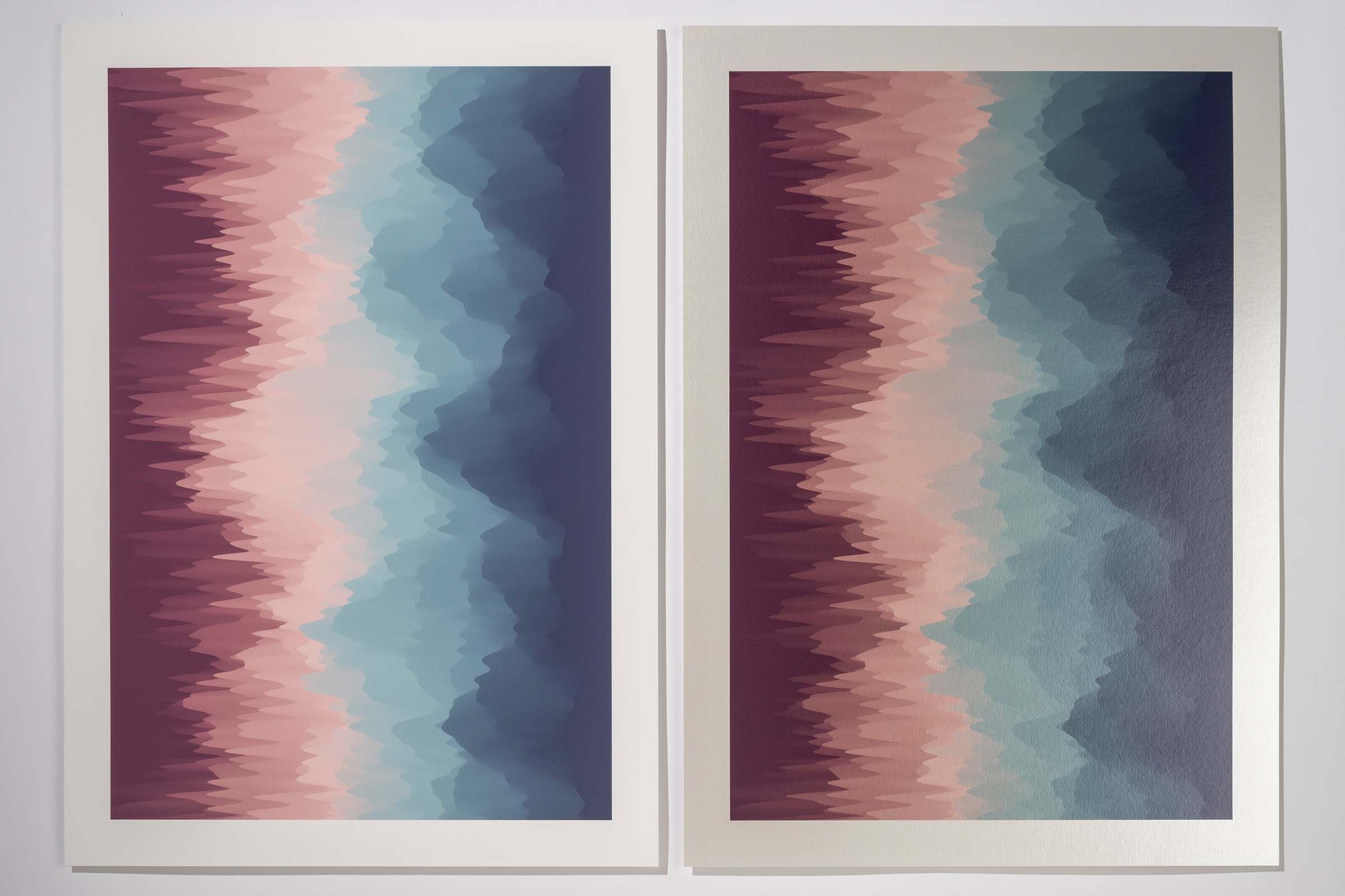 Just as a symphony can be broken down into many overlapping pure tones, so too can a landscape. To demonstrate this, a single function was created which was composed of many independent overlapping frequencies. High frequencies were then dampened as the function was both shifted downward and overlaid onto itself, creating an apparent transition from sharp crags to rolling foothills. A color palette was selected to resemble the phenomenon of alpenglow, which occurs when scattered light in the atmosphere illuminates the peaks of mountains, even when the sun is below the horizon.